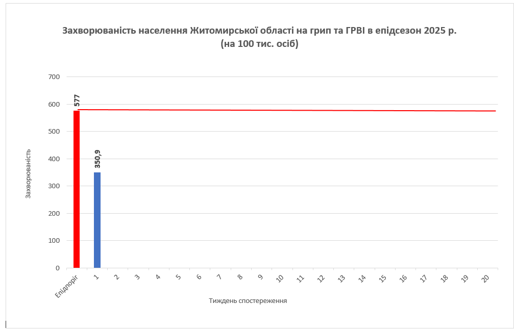 На 1 тижні спостереження (в період 30.12.2024 – 05.01.2025р.) відбувається подальше зниження рівнів захворюваності ГРВІ, що триває з грудня 2024 року: зафіксовано зниження рівнів в порівнянні з попереднім тижнем на 23%. Зареєстровано 4141 хвора особа, показник 350,9 на 100 тисяч населення нижчий за епідемічний поріг на 39%. Захворюваність залишається на неепідемічному рівні.