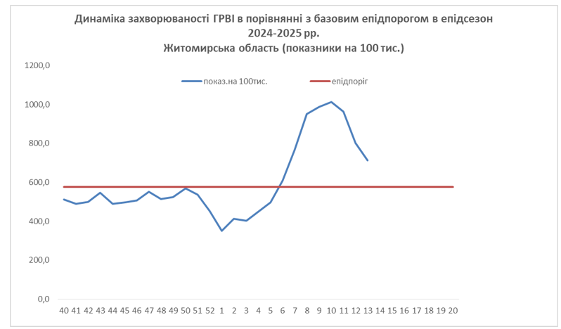 Показник на 100 тисяч населення становить 712,1 , перевищує епідемічний поріг на 23% та відповідає середньому рівню інтенсивності епідемічного процесу.