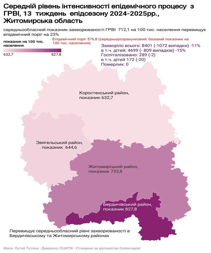 На 13 тижні спостереження епідемічного сезону 2024/2025рр. з ГРВІ зареєстровано 8401 хворий, що на 1072 випадки менше ніж минулого тижня (-11%) .