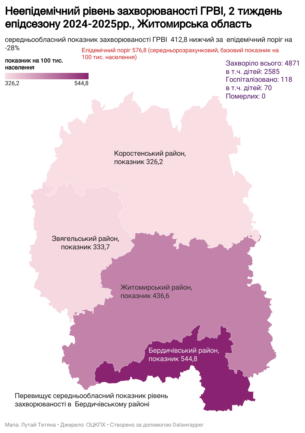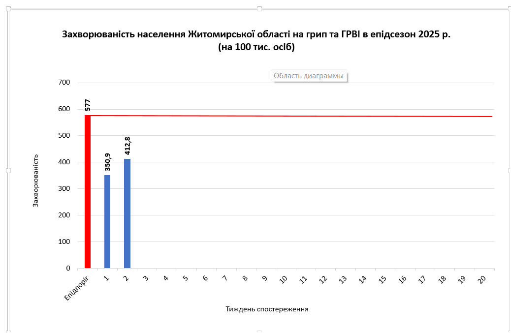 Показник 412,8 на 100 тисяч населення нижчий за епідемічний поріг на 28%. Захворюваність з початку епідсезону 2024/2025 рр. з ГРВІ залишається на неепідемічному рівні.