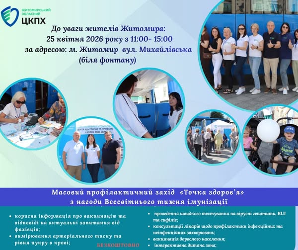 25 квітня з 11:00 до 15:00 у самому серці Житомира, на вул. Михайлівській біля фонтану, працюватиме «Точка здоров’я» до Всесвітнього тижня імунізації!