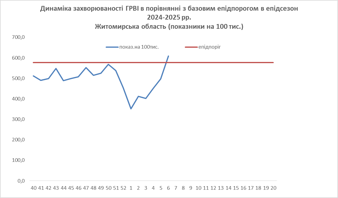 На 6 тижні спостереження (в період 03.02.2025 – 09.02.2025р.) відбувається суттєве зростання рівнів захворюваності ГРВІ на 22% (+1308 випадків) в порівнянні з попереднім тижнем. Відмічається перевищення епідемічного порогу низького рівня: показник 608,8 перевищує середньорозрахунковий, базовий показник (епідемічний поріг) 576,8 лише на 6%.