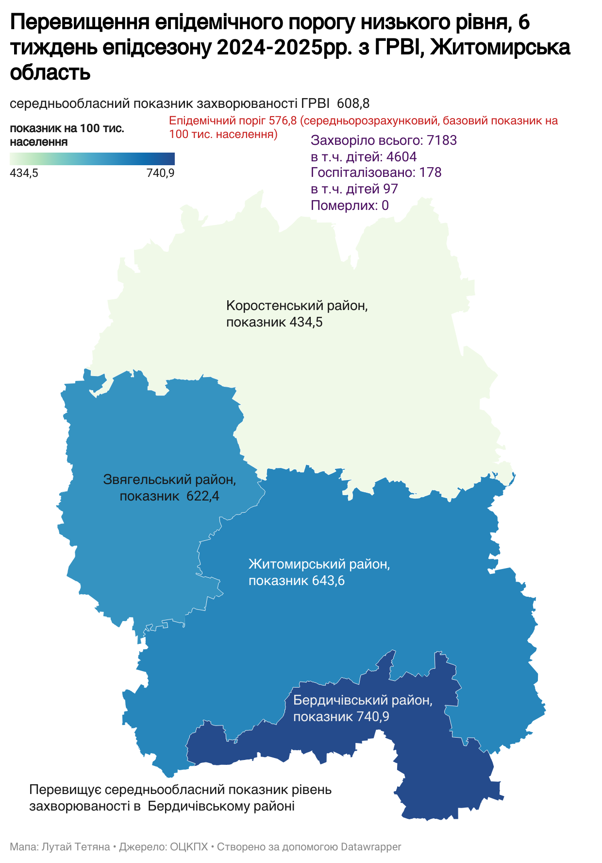 Найбільший приріст захворілих відмічається у Звягельському районі (+33,5%) та Бердичівському районі (+29,5%). Захворюваність в Житомирському та Коростенському районах зросла на 18% в порівнянні з попереднім тижнем.