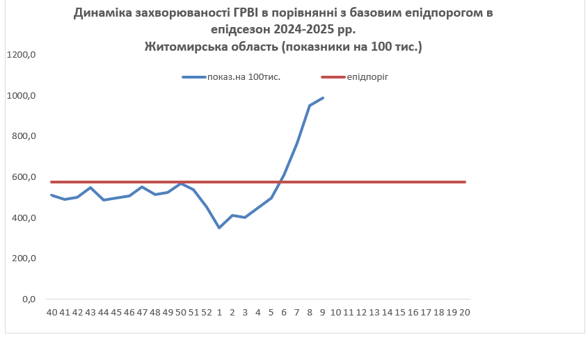 Другий тиждень поспіль інтенсивність епідемічного процесу знаходиться на високому рівні. На 9 тижні спостереження темпи зростання захворюваності уповільнилися в порівнянні з попереднім тижнем: захворюваність зросла лише на 4% (+423 випадки). Показник 987,3 на 100 тисяч населення перевищує епідемічний поріг (576,8) на 71%.