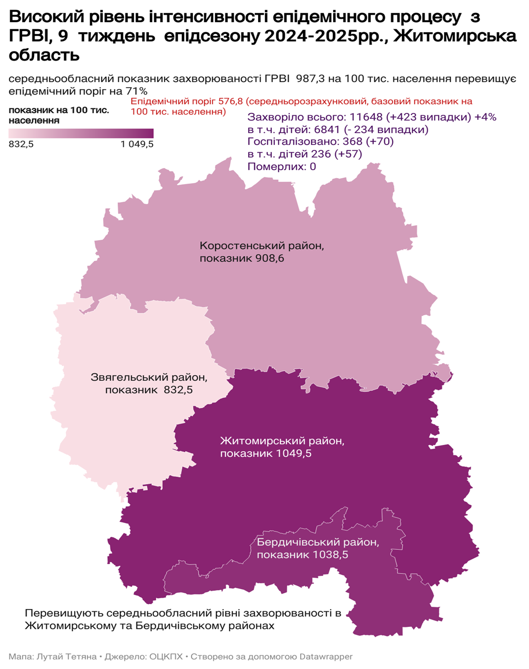 Продовжується зростання захворюваності в Житомирському районі (+10%) та Бердичівському районі (+5%). В цих районах показники захворюваності перевищують середньообласний та складають відповідно 1049,5 та 1038,5 на 100 тисяч населення. В Коростенському та Звягельському районах спостерігається зниження захворюваності на 5%- 9%, показники захворюваності складають відповідно 908,6 та 832,5 на 100 тисяч населення відповідно.