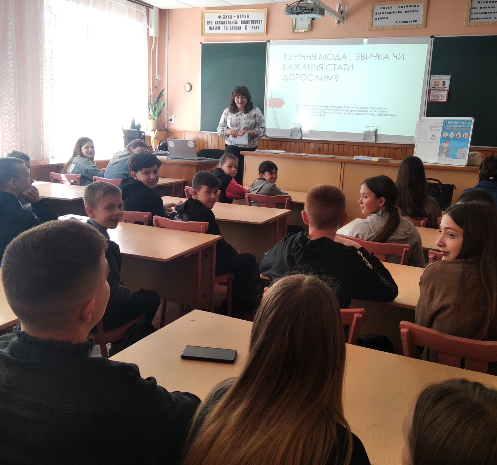 Фахівці Романівського відділення провели виховну зустріч з учнями 7-8 класів Биківського ліцею. Теми зустрічі: «Паління – це мода чи спосіб проявити себе в підлітковому віці?» та «Живи вільно, не будь залежним від наркотиків».