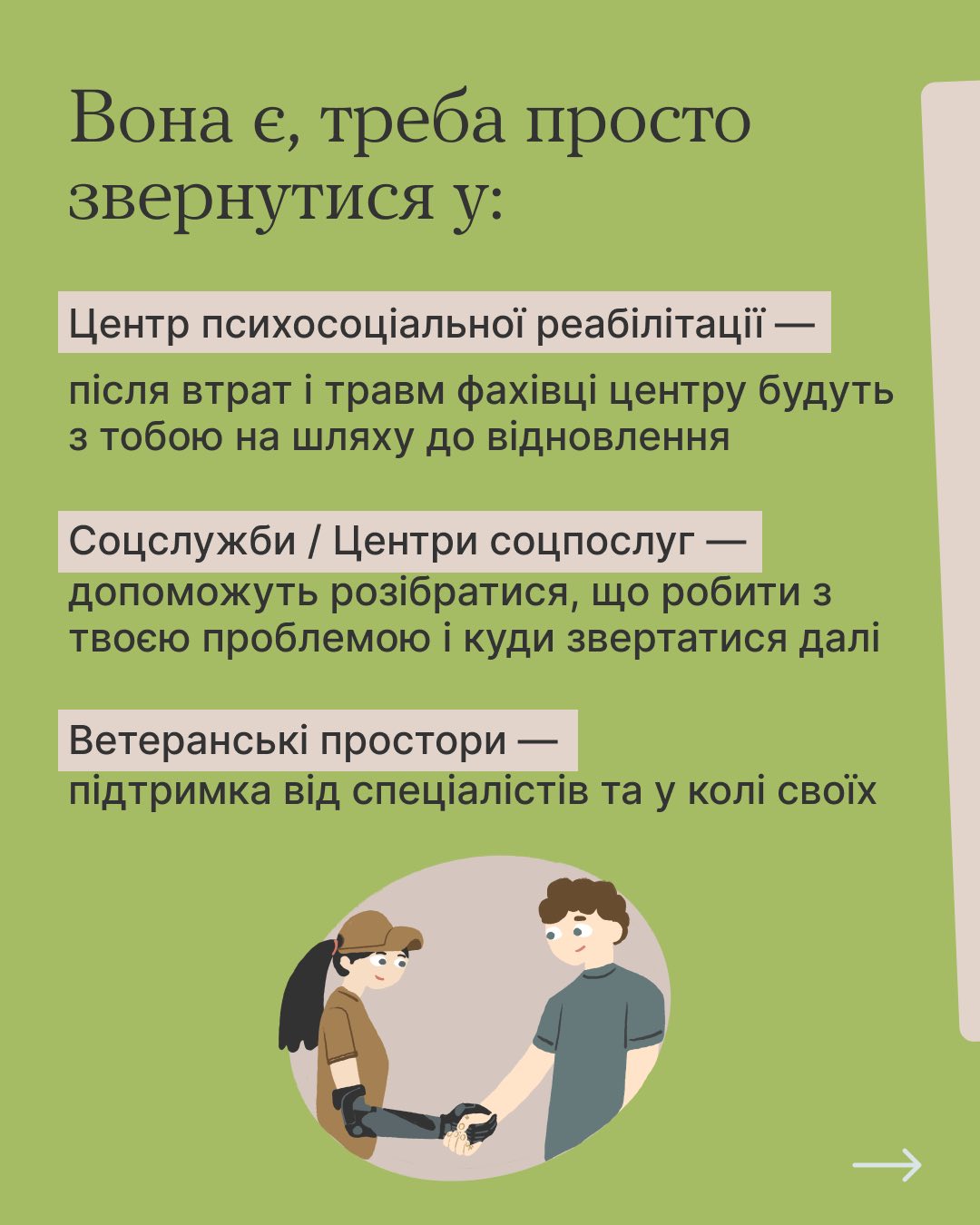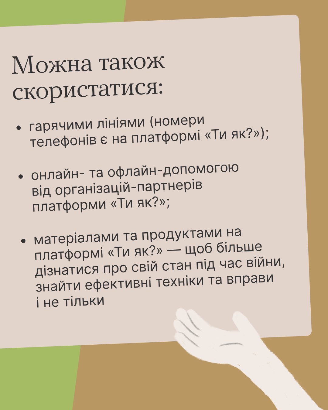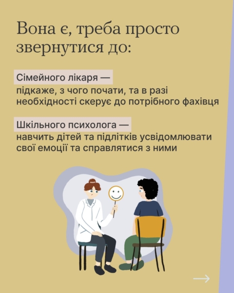 Підтримку для ментального здоров’я можна отримати й від сімейного лікаря, і від соцпрацівника. Головне — не боятися її шукати. А це зовсім нескладно. У каруселі маємо список перевірених місць, де про тебе потурбуються