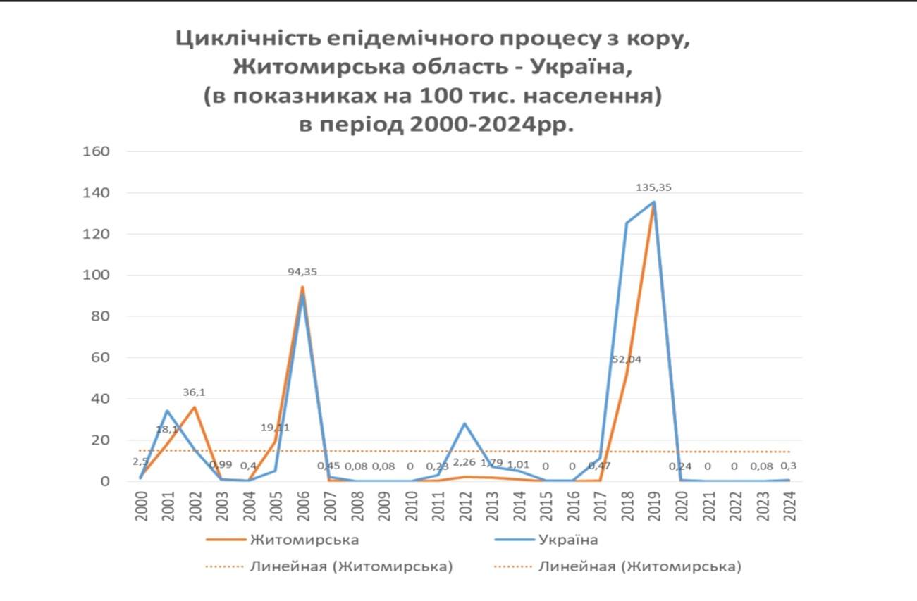 Впродовж 2-х останніх років в Житомирській області зареєстровано 5 випадків кору в Бердичівському районі: 1 випадок в 2023 році, показник на 100 тисяч населення становить 0,08 та 4 випадки в 2024 році, показник 0,3.