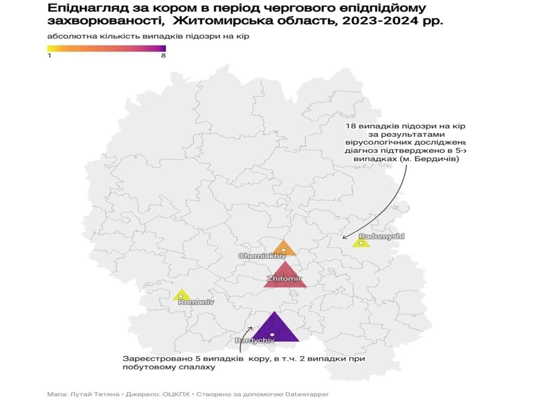 Рівень захворюваності кором по Житомирській області нижчий за середній по Україні.