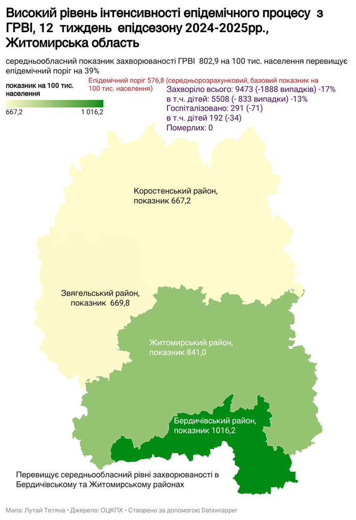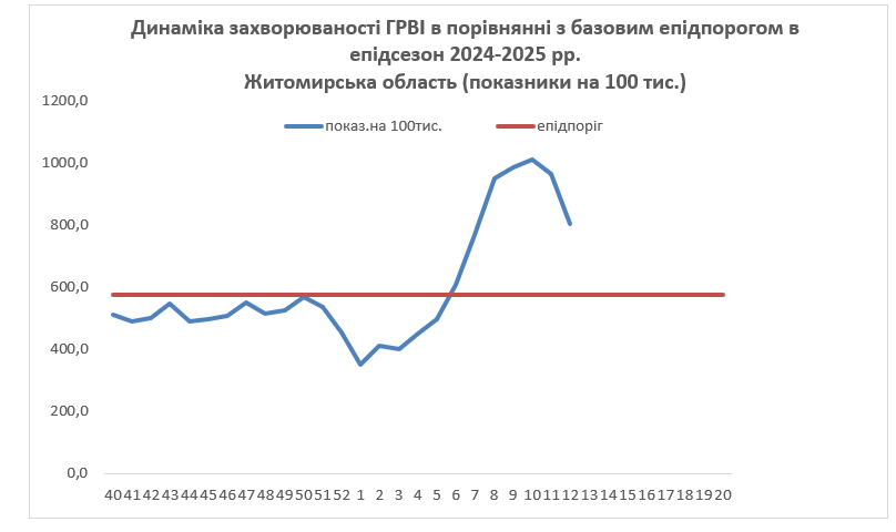 Показник на 100 тисяч населення становить 802,9, перевищує епідемічний поріг на 39% та відповідає високому рівню інтенсивності епідемічного процесу.