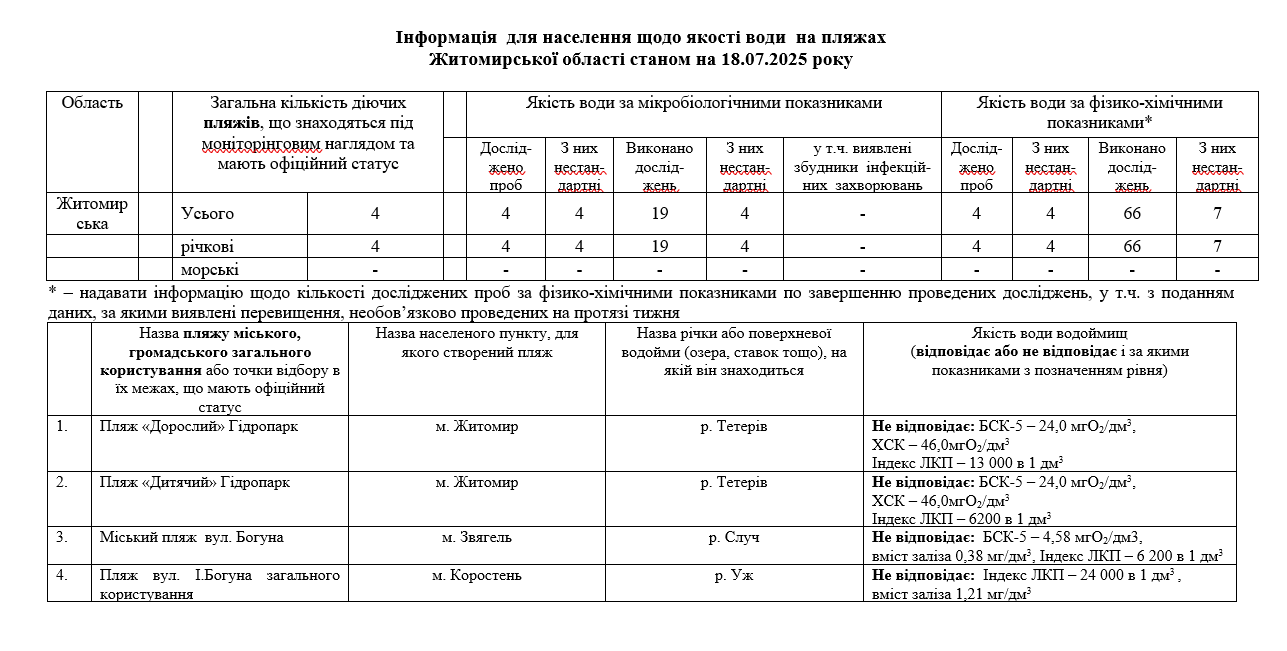 Інформація для населення щодо якості води на пляжах Житомирської області станом на 18.07.2025 року