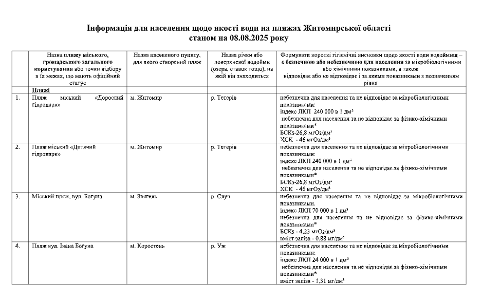 Інформація для населення щодо якості води на пляжах Житомирської області станом на 8.08.2025 року