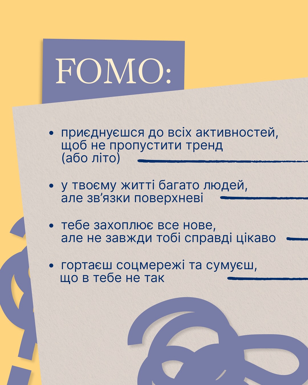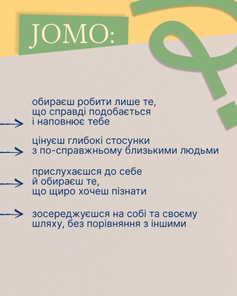 З англійської Joy of Missing out (JOMO) вчить отримувати задоволення від того, що ти свідомо відмовляєшся від можливостей на користь власному комфорту