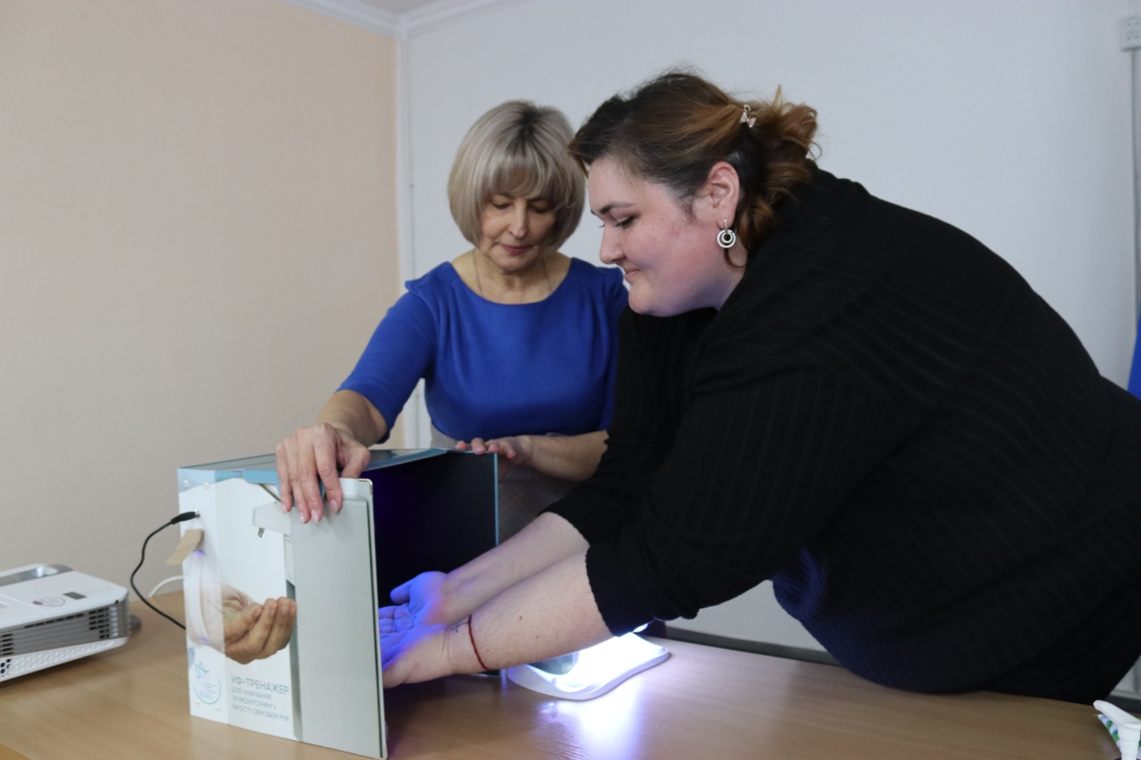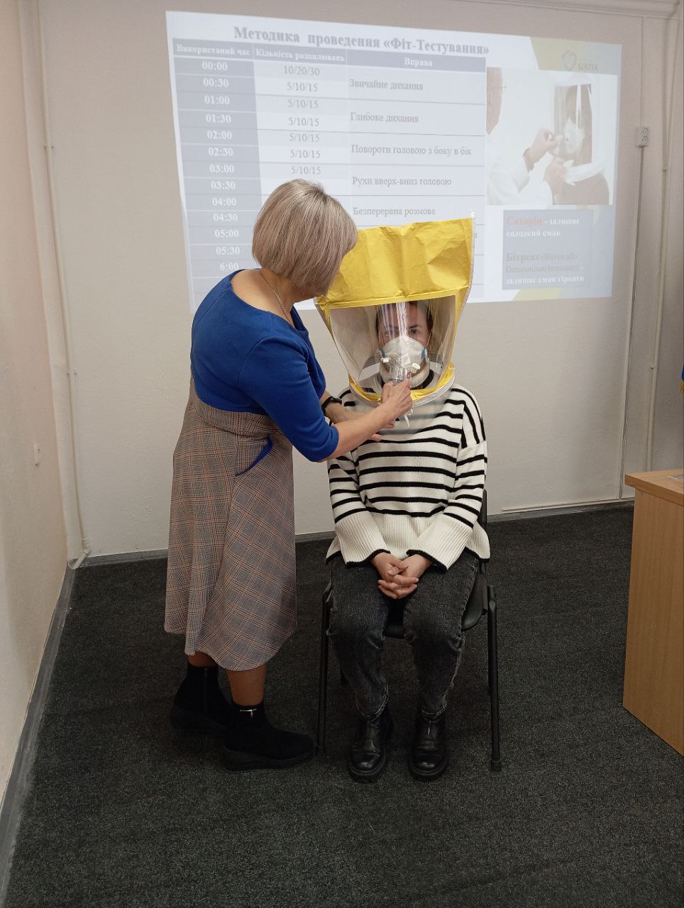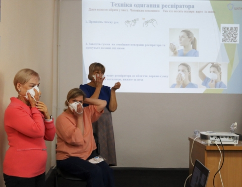 Крім того, в процесі навчання були відпрацьовані практичні навички з гігієни рук з використанням УФО-боксу, порядок використання засобів індивідуального захисту та проведено Фіт-тестування.