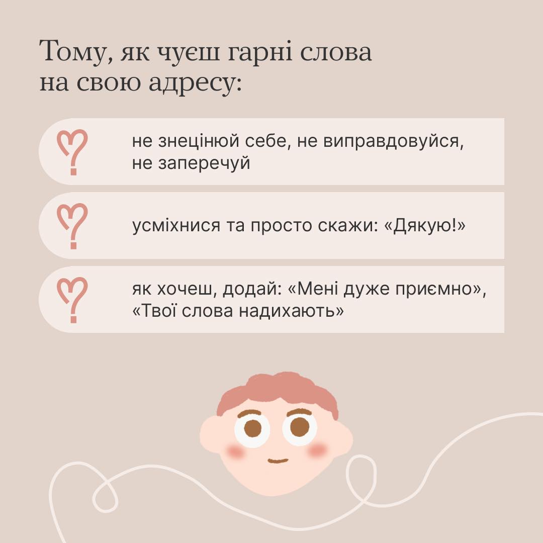Розповідає в каруселі, чому це не так і як приймати добрі слова, які адресують тобі.