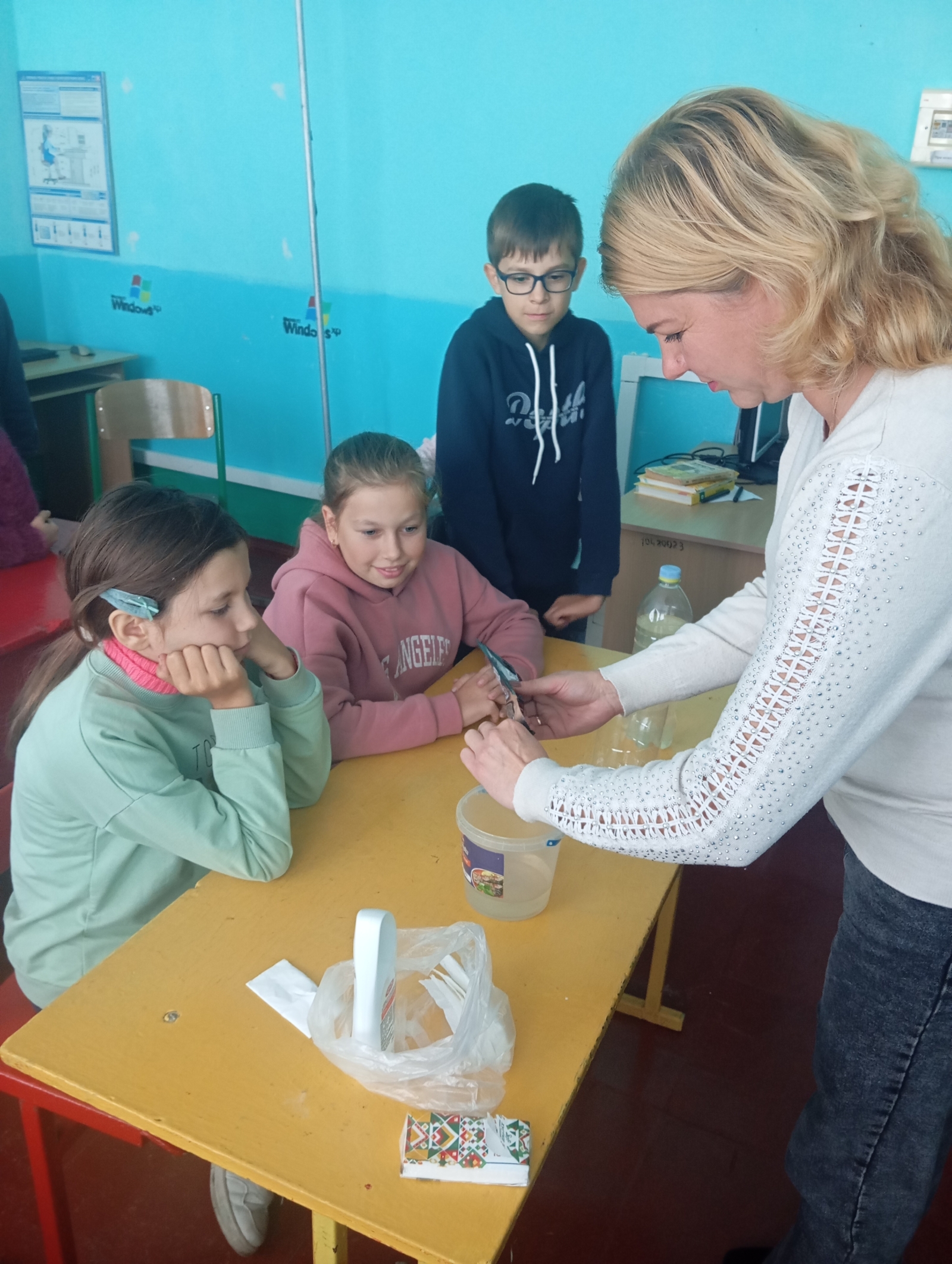 Щоб краще засвоїти матеріал, школярі взяли участь в інтерактивній грі та провели досліди з милом, «мікробами» та водою.