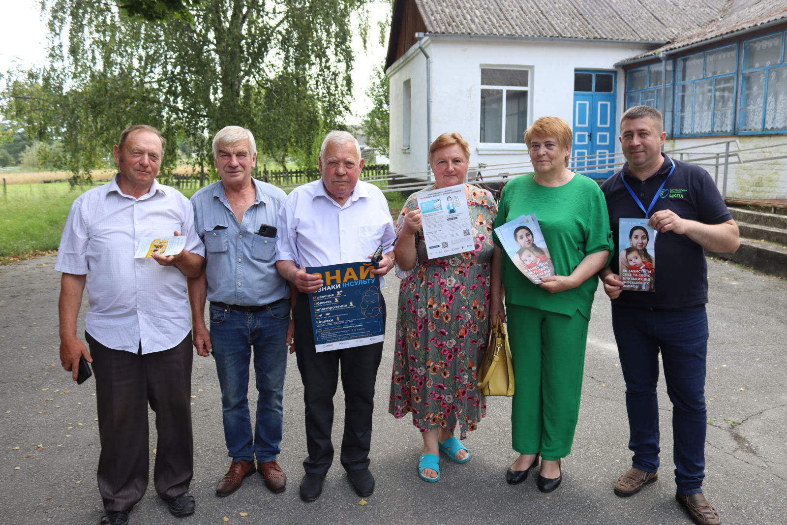 Мешканці села отримали просвітницьку друковану продукцію – інформаційні пам’ятки щодо профілактики неінфекційних захворювань, календарі профілактичних щеплень, інформаційні матеріали стосовно профілактики вірусних гепатитів, правильного поводження у спеку, профілактики серцево-судинних захворювань, імунізації населення та захисту себе і своїх близьких від вакцинокерованих інфекційних захворювань.