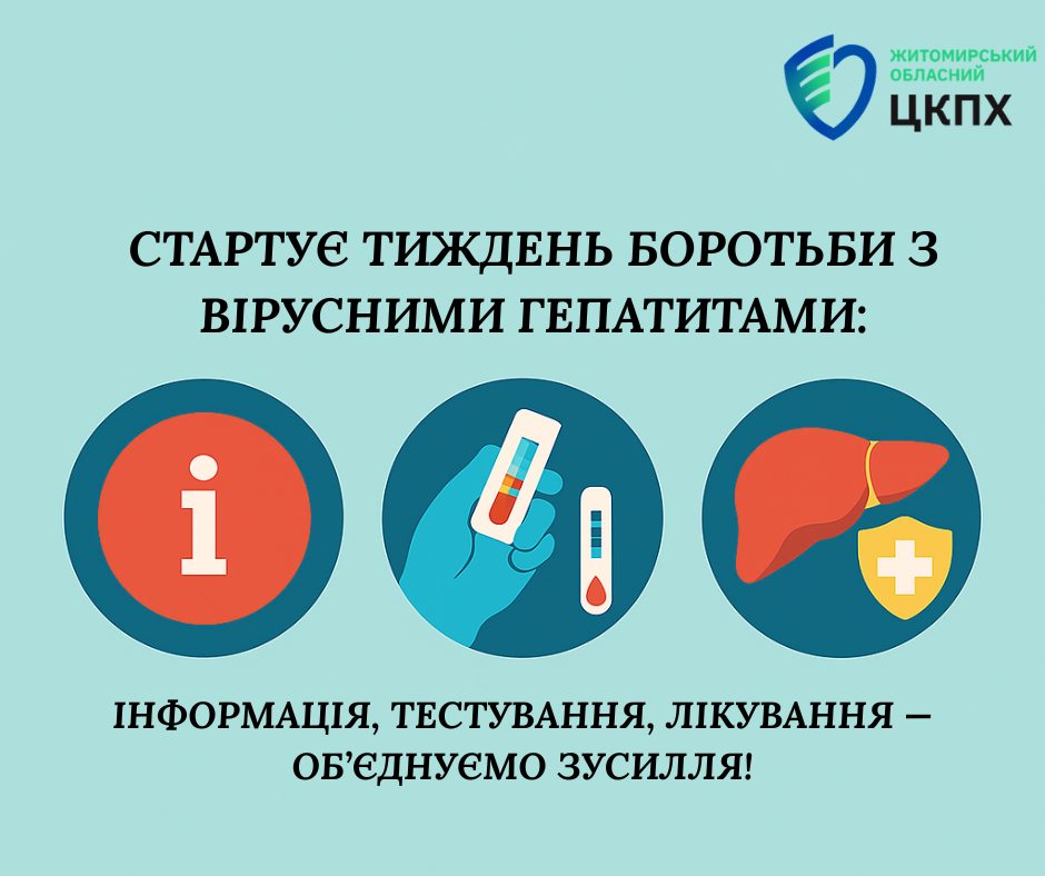 З 28 липня по 1 серпня 2025 ДУ “Житомирський центр контролю та профілактики хвороб МОЗ України” в межах національної кампанії до Всесвітнього дня боротьби з вірусними гепатитами організує інформаційно-просвітницькі заходи для населення.