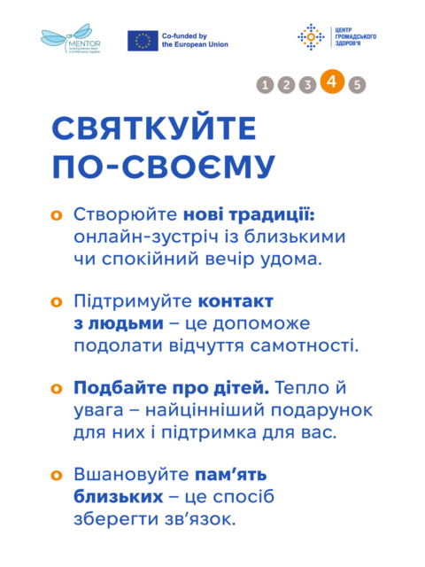 Проте і дозволити собі радість — це не зрада, а спосіб відновити сили й підтримати себе та людей поруч. Разом з тим небажання долучатися до святкування — це нормально, і змушувати себе до веселощів не варто. Центр громадського здоров’я наводить кілька практичних порад, як упоратися з переживаннями та зробити святковий період комфортним https://tinyurl.com/y9y3nvmh