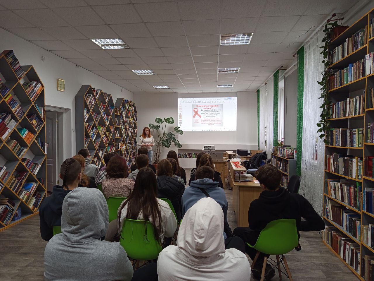 Фахівці Андрушівського відділення Бердичівського районного відділу провели змістовну бесіду з відеопрезентацією у Андрушівській міській бібліотеці для учнів 10-Б класу Андрушівського ліцею №2 та працівників бібліотеки як запобігати стигматизації й дискримінації людей з позитивним ВІЛ-статусом.