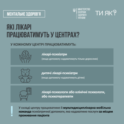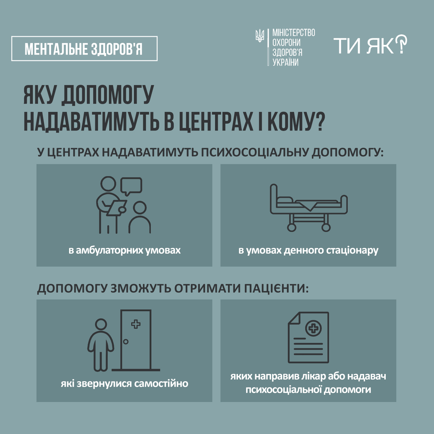 Люди, які потребуватимуть такої допомоги, зможуть отримати її амбулаторно та в умовах денного стаціонару. У складі центрів також працюватимуть мультидисциплінарні мобільні команди психіатричної допомоги, що надають послуги за місцем проживання пацієнта.