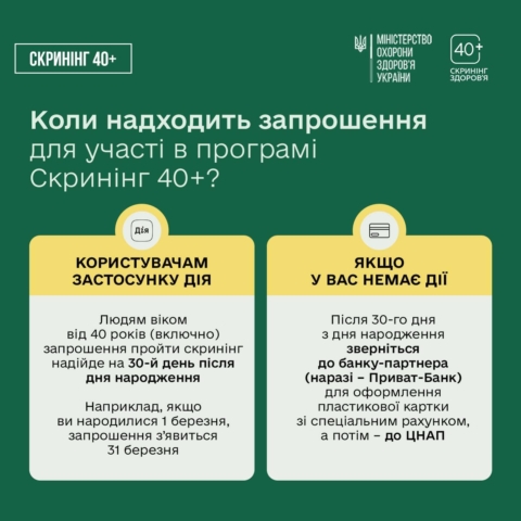 Більше про те, коли ви отримаєте запрошення на проходження Скринінгу здоров’я 40+, як оформити послугу та в який термін — розповідаємо у каруселі.