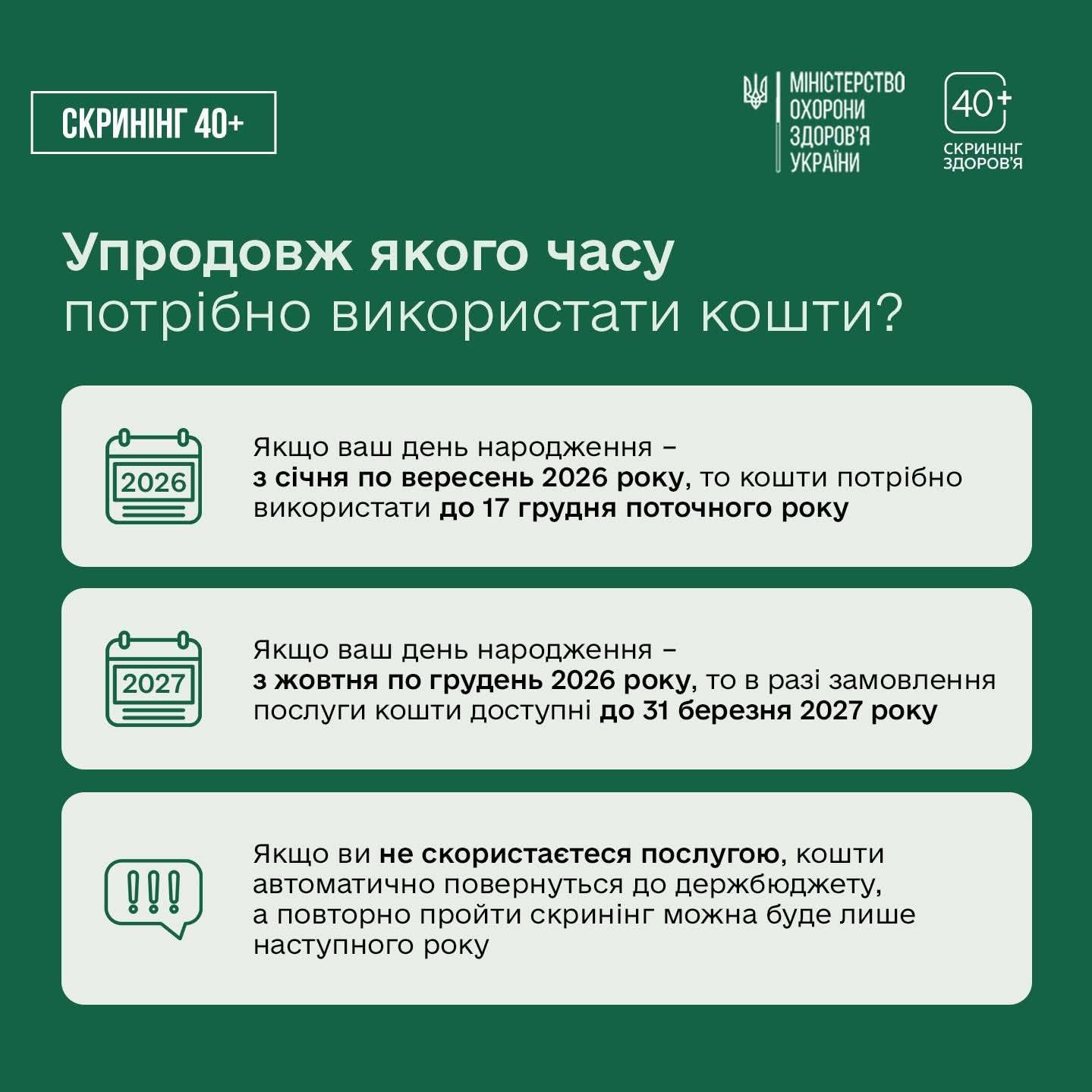 Детальну інформацію про програму Скринінг здоров’я 40+ та відповіді на найпоширеніші запитання знайдете за посиланням: screening.moz.gov.ua