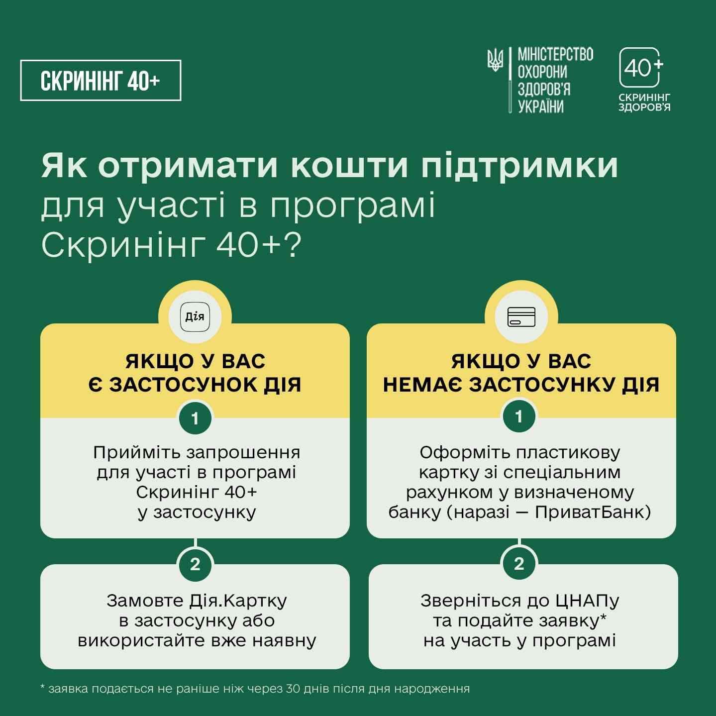 Запрошення на скринінг надходитиме в застосунок Дія на 30-й день після дня народження — для людей віком від 40 років і більше.
