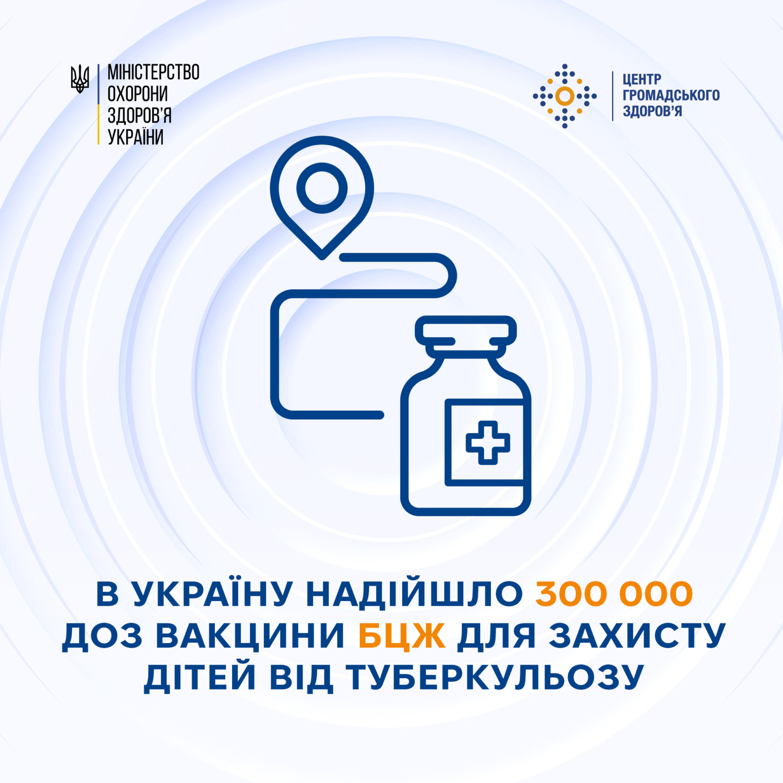 В Україну надійшло 300 000 доз вакцини БЦЖ від туберкульозу для безоплатного щеплення дітей за Національним календарем профілактичних щеплень. Ці вакцини Україна отримує в рамках співпраці Міністерство охорони здоров’я України з Глобальним альянсом з вакцин та імунізації (Gavi, the Vaccine Alliance).