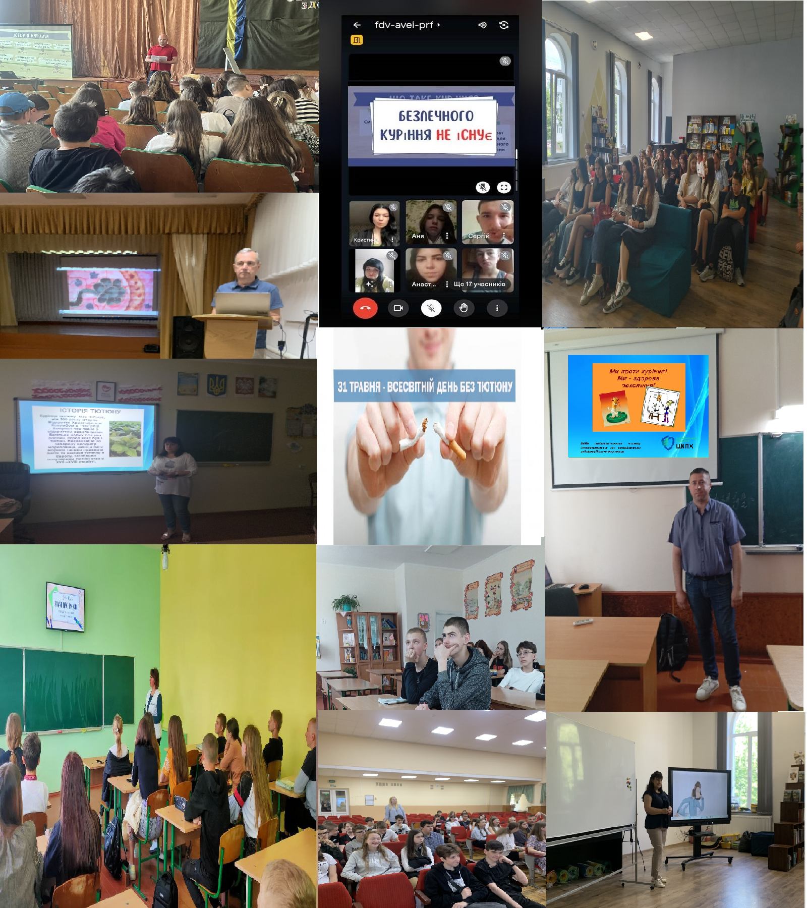 31 травня відзначається Всесвітній день без тютюну. До цієї дати фахівці Житомирського обласного центру контролю та профілактики хвороб та відокремлених підрозділів в усіх районах області провели низку інформаційно-просвітницьких заходів про ризики тютюнопаління в освітніх закладах серед учнів VII-ХІ класів. Зустрічі відбулися в ліцеях №2, 4, 5, 7, 14, 23, 26, 31, 35 міста Житомира, ліцеях та професійних училищах Бердичівського, Звягельського та Коростенського районів. Загалом відвідано 110 навчальних закладів.