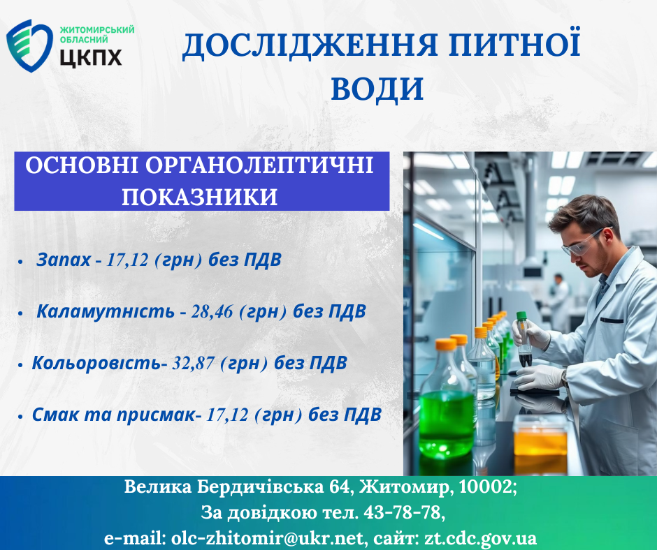 Повідомляємо, про надання послуг комплексного дослідження питної води централізованого та децентралізованого водопостачання в ДУ « Житомирський центр контролю та профілактики хвороб МОЗ України »