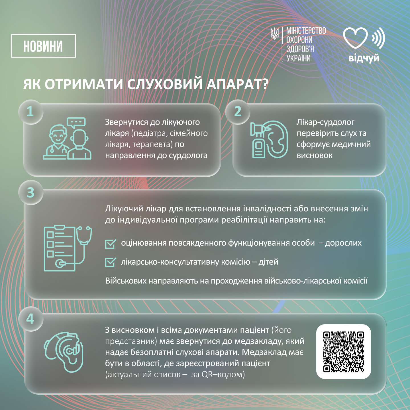 Крім того, МОЗ разом із ГО «Відчуй», розробили зручний путівник, у якому покроково описано, як отримати слуховий апарат у нашому регіоні. Його можна знайти за посиланням.