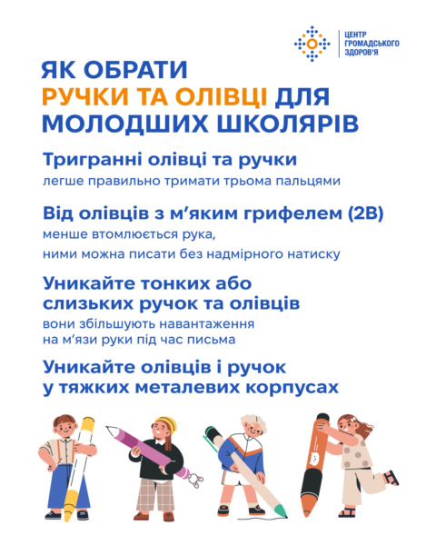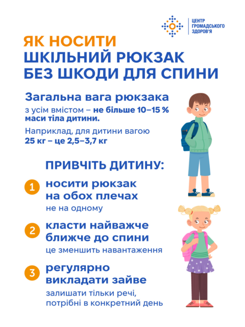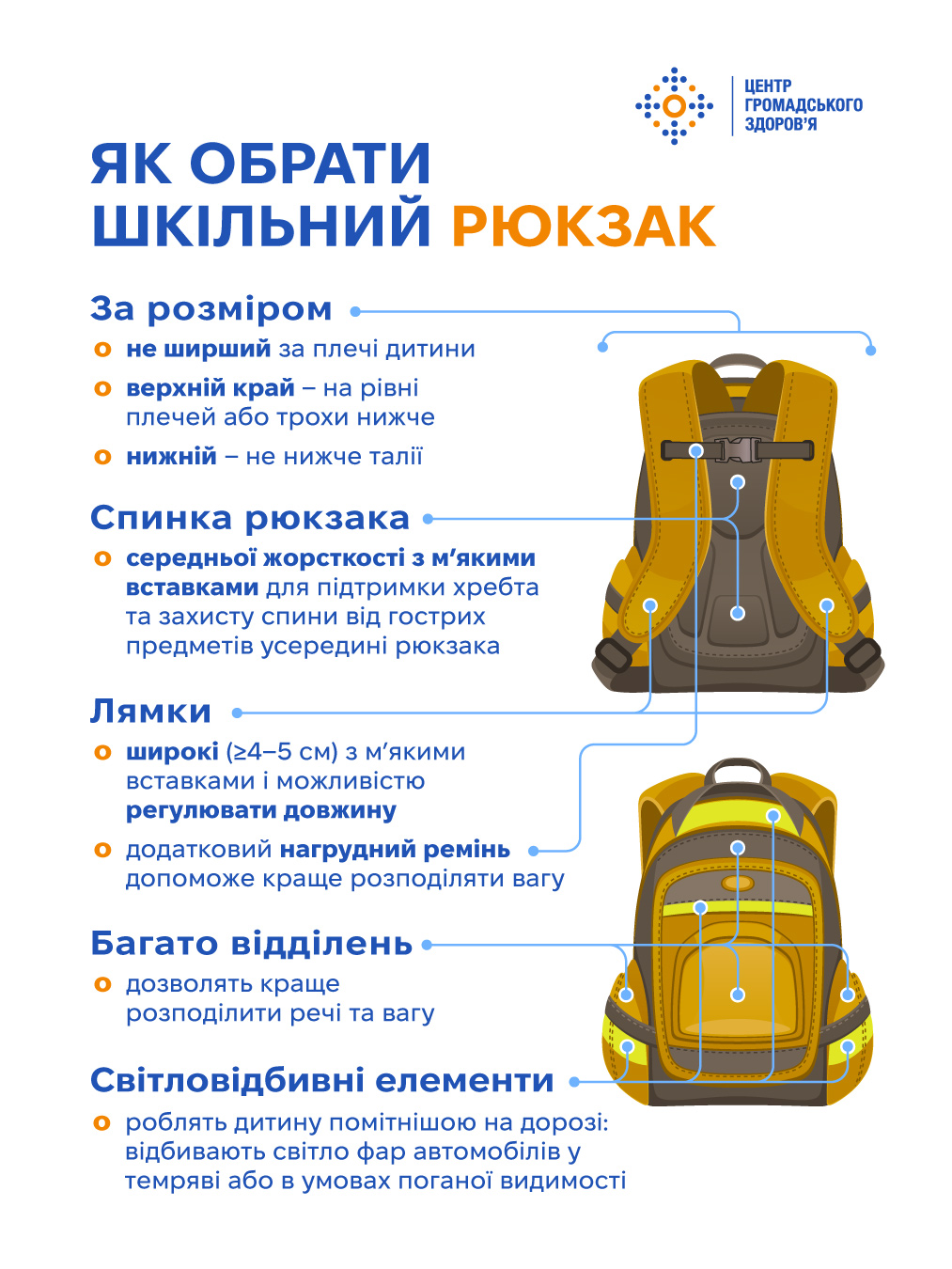 До початку навчального року Центр громадського здоров’я України підготував поради, як правильно обрати рюкзак і письмове приладдя, щоб зменшити фізичне навантаження на тіло дитини та зробити навчання комфортнішим: