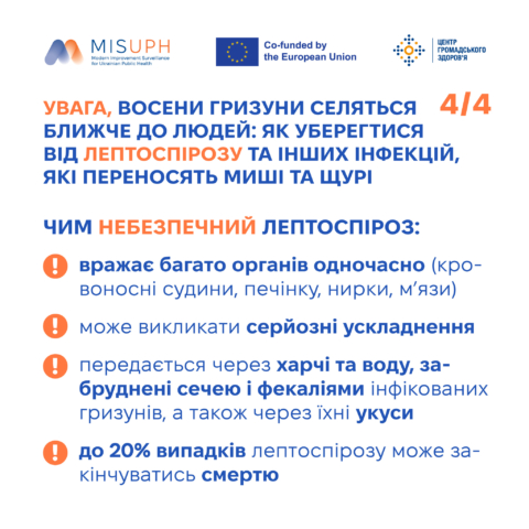 Сезонний пік захворюваності на лептоспіроз припадає на серпень, вересень і жовтень — з настанням похолодання. Чим небезпечний лептоспіроз і як уберегтися від нього — в інфографіці Центр громадського здоров’я України