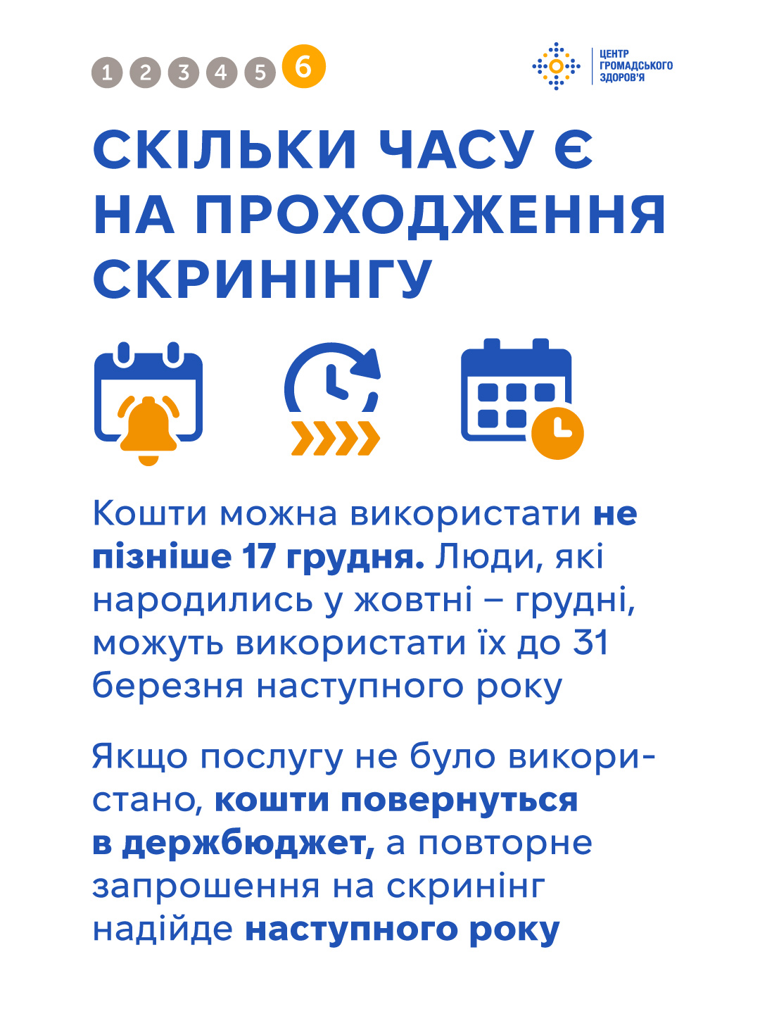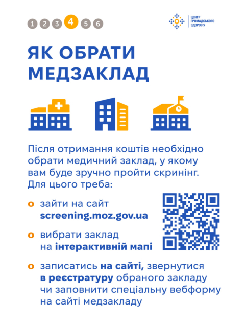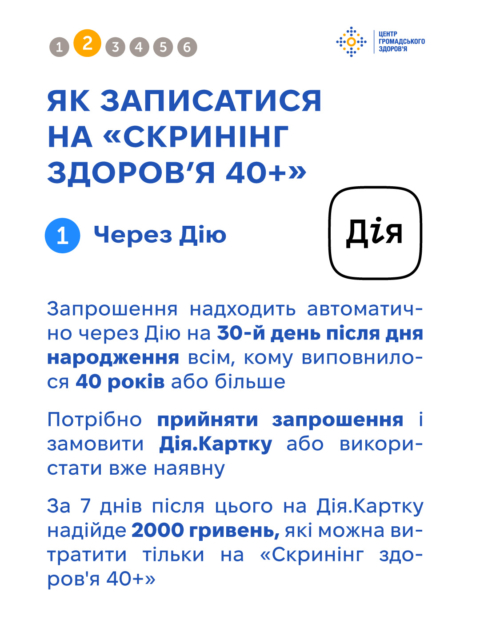 Центр громадського здоров’я пояснює, як скористатися програмою «Скринінг здоров’я 40+» — гортайте картки і зберігайте допис, аби корисні підказки завжди були під рукою