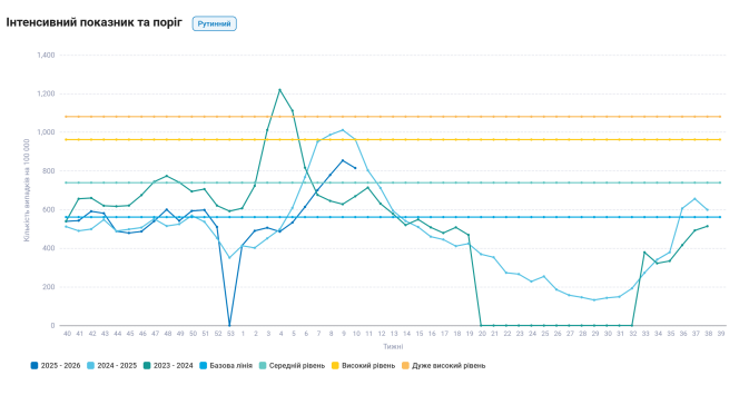 9 березня 2026Протягом 10 тижня 2026 року захворюваність на гострі респіраторні вірусні інфекції серед населення Житомирської області пішла на спад. Так, зареєстровано 9619 випадків (815,3 на 100 тис.нас.), що на 4,6% менше ніж минулого тижня. В тому числі 18 випадків Covid-19, що на 9 випадків менше ніж минулого тижня, 7 з них серед дітей. Показники захворюваності вище епідемічного порогу на 45,3% і відповідає середньому рівню інтенсивності епідемічного процесу.